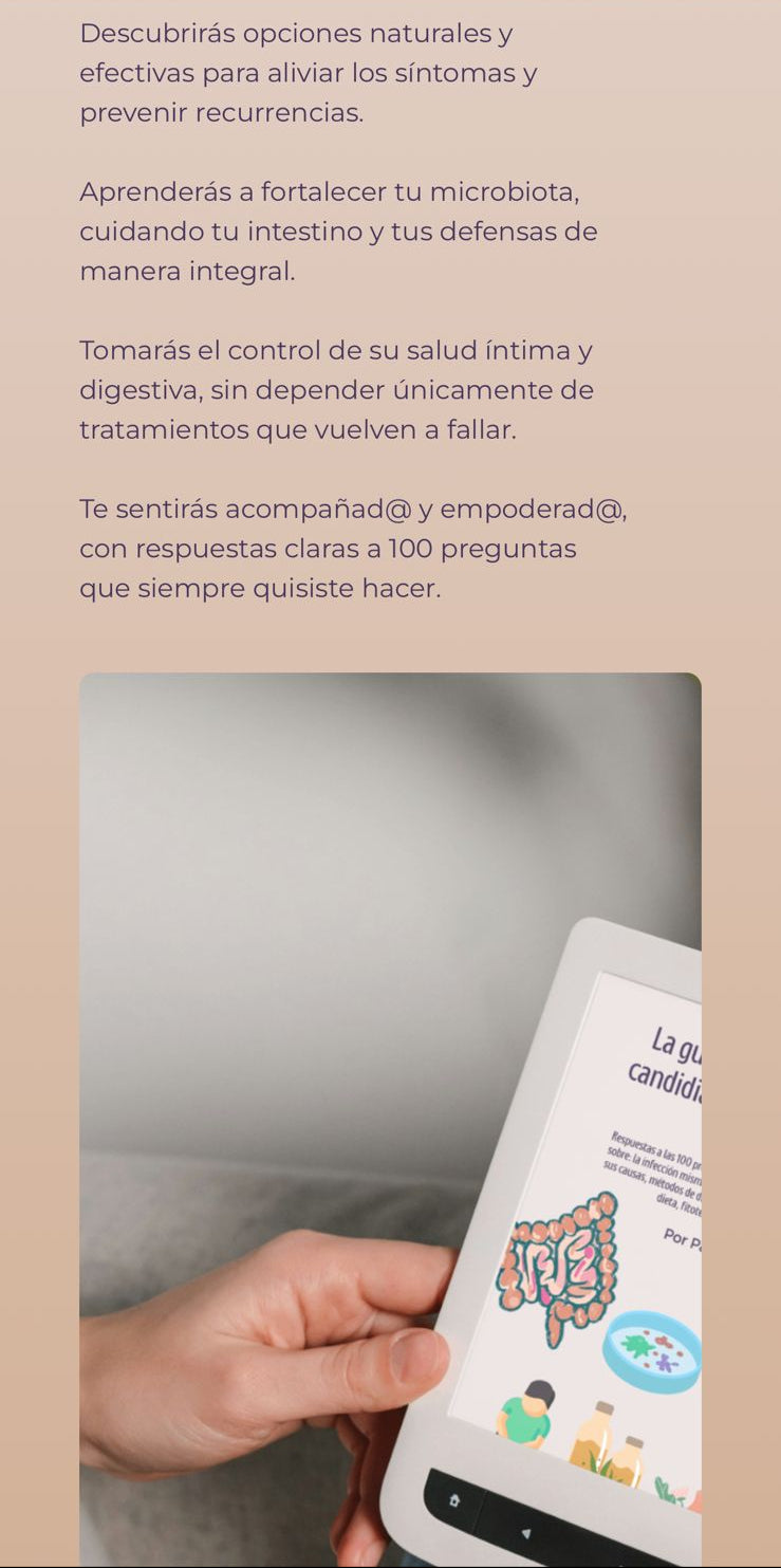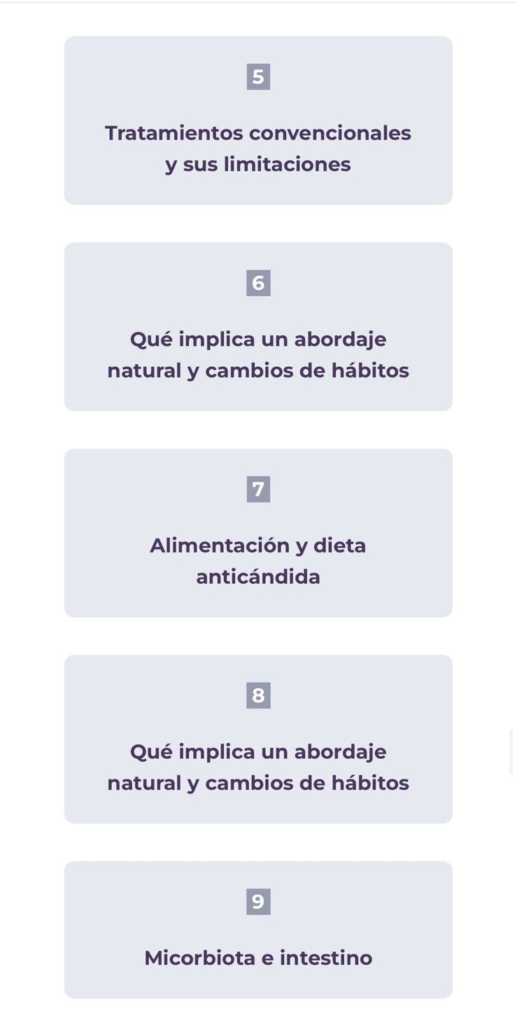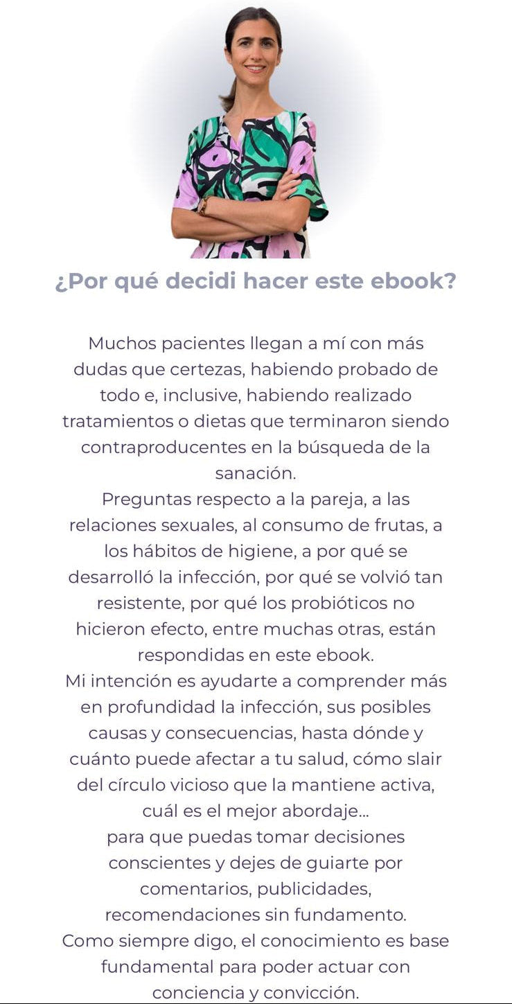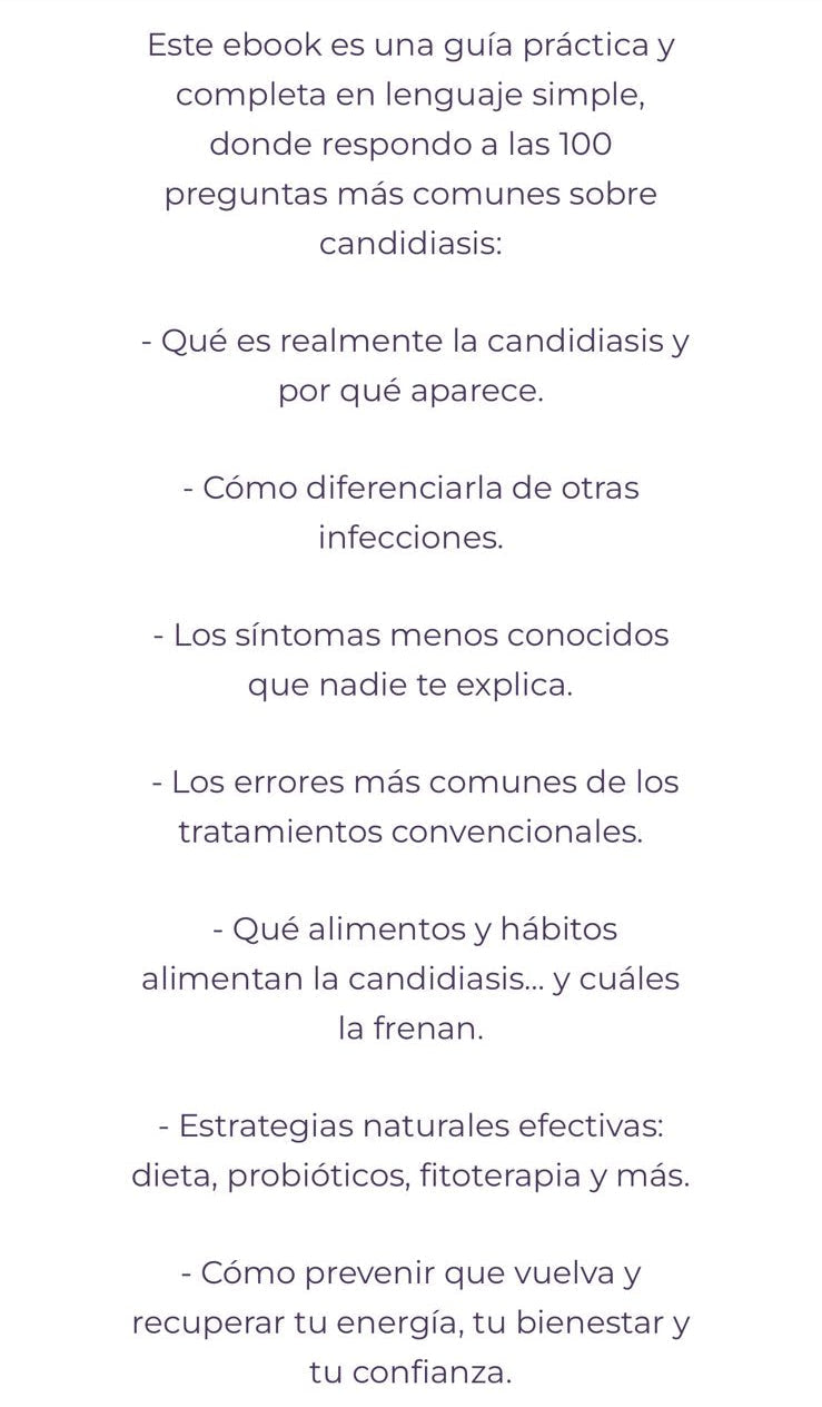 Este ebook en formato digital responde a las 100 preguntas más frecuentes sobre la candidiasis: qué es realmente, cómo reconocerla, cuáles son sus causas, los errores más comunes de los tratamientos convencionales, y qué opciones naturales existen para tratarla y prevenirla.