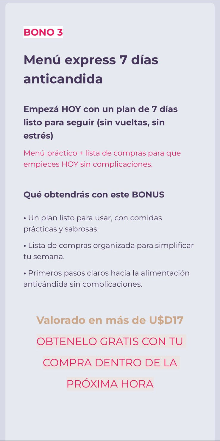 - Plan exprés de 7 días anticándida: menú práctico con lista de compras para empezar ya mismo.